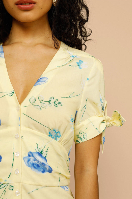 Robe Midi Jaune A Fleurs Bleues | Fraîche & Romantique | Printemps & Garden-Parties | Tissu Fluide