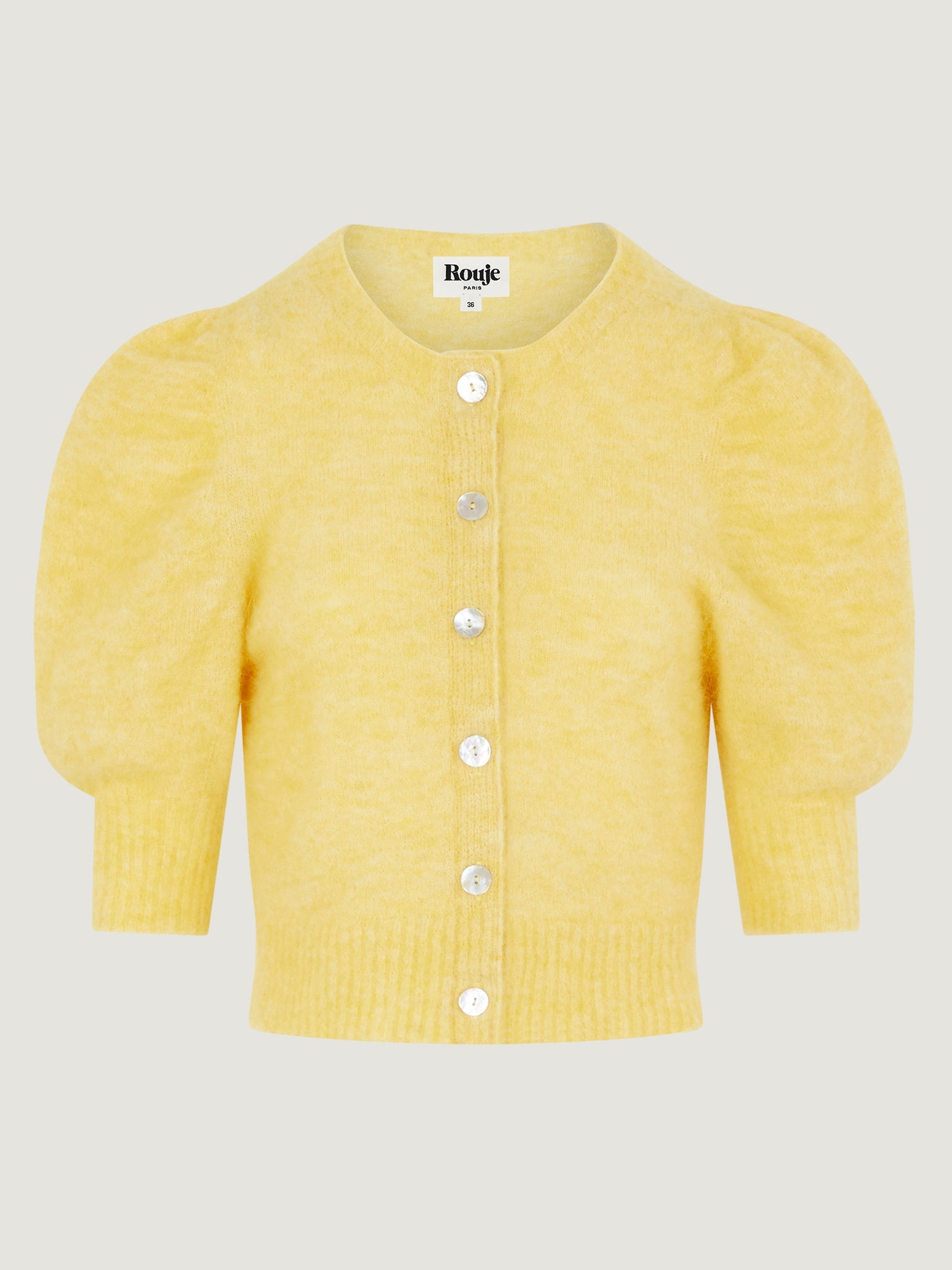 Ce gilet jaune à manches bouffantes et boutons nacrés apporte charme et modernité à votre look. Sa coupe courte et sa maille douce en font une pièce idéale pour la mi-saison.