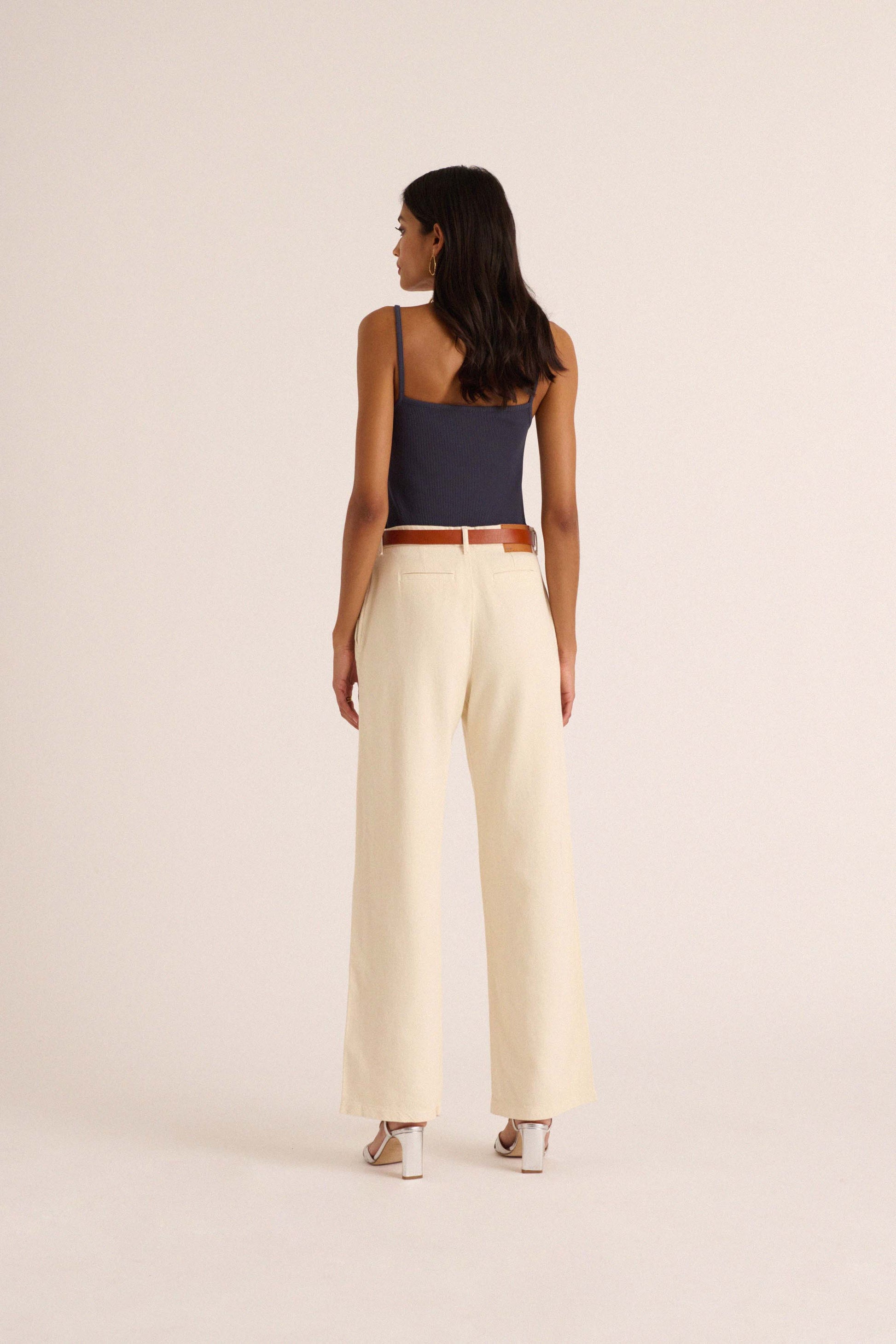 Ce pantalon écru à jambe large, confectionné en 100% coton, est une pièce incontournable pour une silhouette fraîche, élégante et confortable.