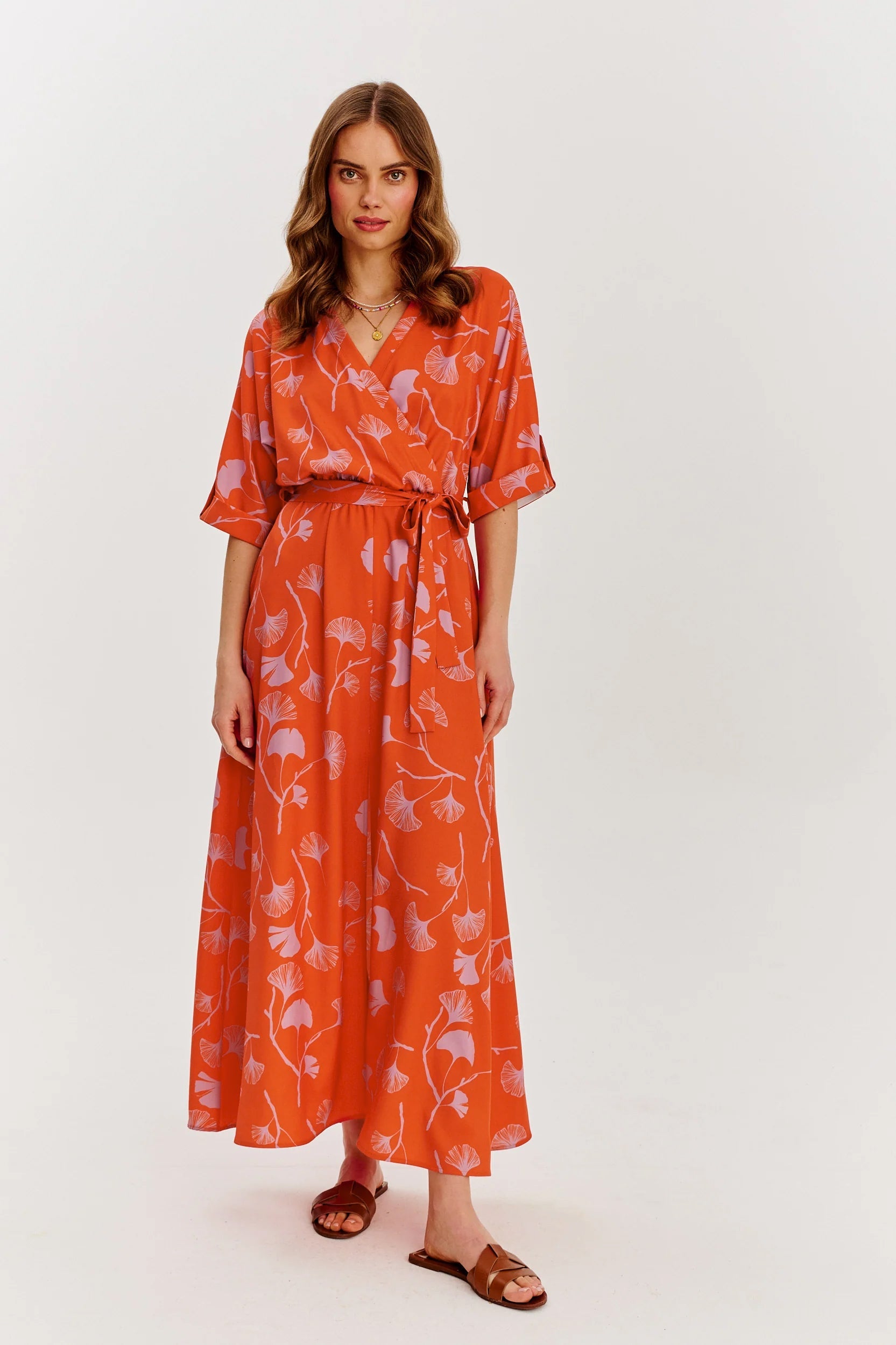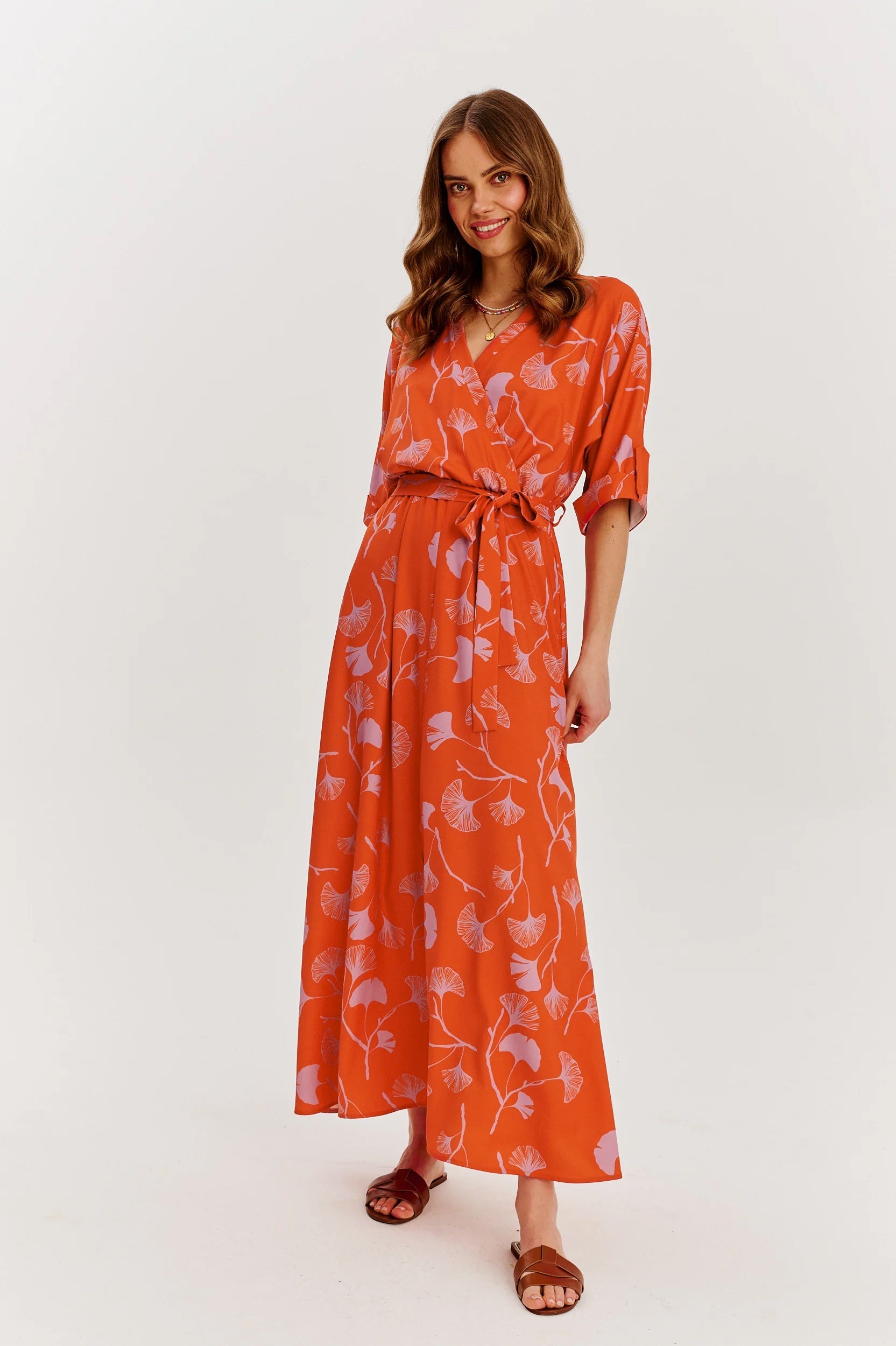 Cette robe longue orange à imprimé feuillage offre une silhouette légère et aérienne, parfaite pour les moments où style rime avec confort. Avec sa ceinture ton sur ton et son col en V, elle sublime toutes les morphologies.