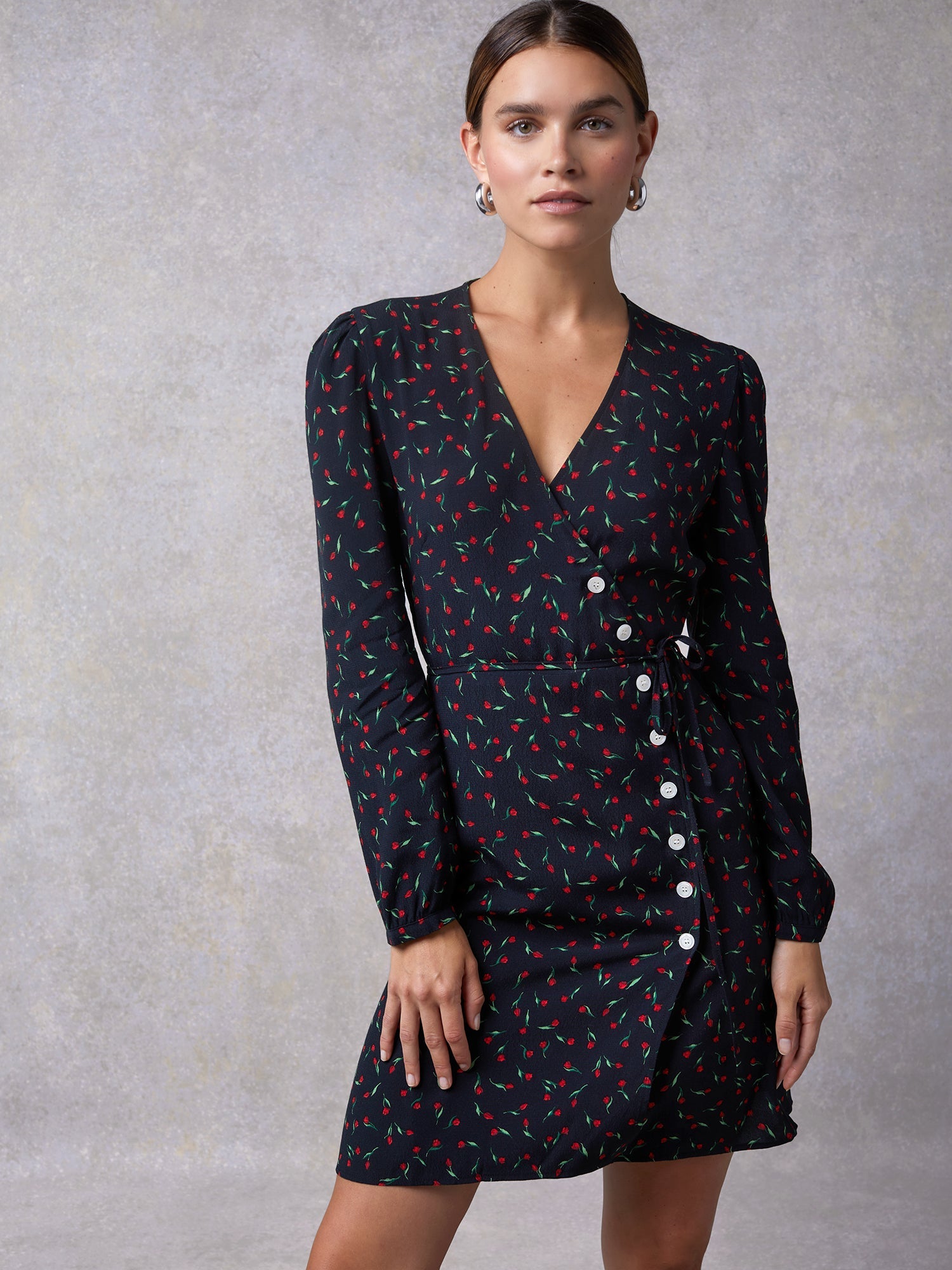 Cette robe courte à manches longues et imprimé à pois revisite le style portefeuille avec une touche moderne. Son jeu de boutons latéraux ajoute une note sophistiquée à sa coupe fluide et flatteuse.