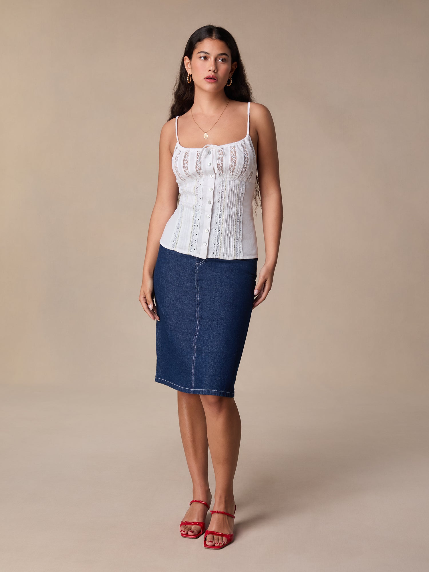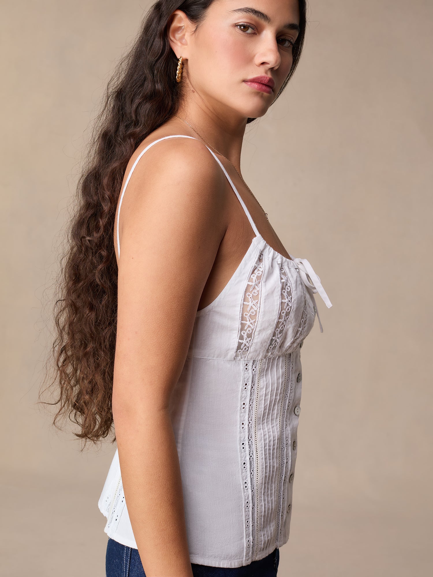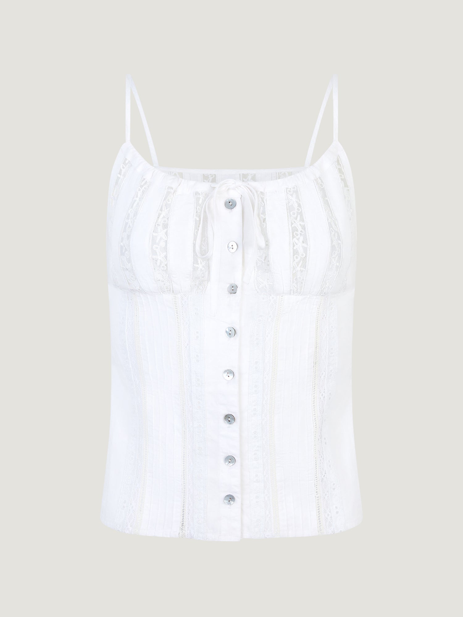 Ce top blanc à fines bretelles et détails ajourés allie charme et féminité avec une allure légère et sophistiquée. Sa coupe ajustée et sa rangée de boutons sur le devant en font une pièce tendance et facile à porter.